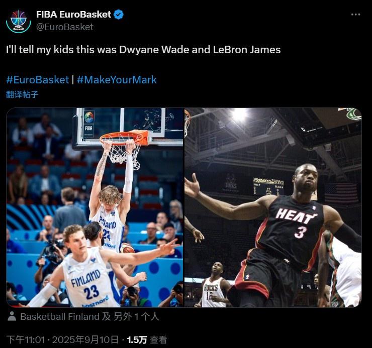 欧锦赛官方配文道:我会和我的小孩讲,这就是韦德和詹姆斯。