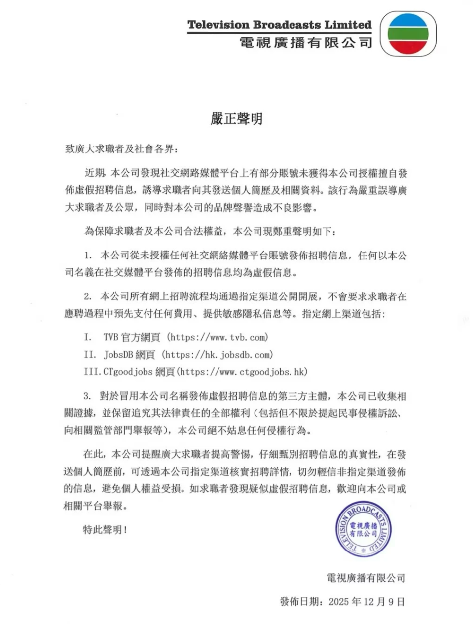 12月12日,香港电视广播有限公司(TVB)在社交平台发布致广大求职者及社会各界的“严正声明”称: