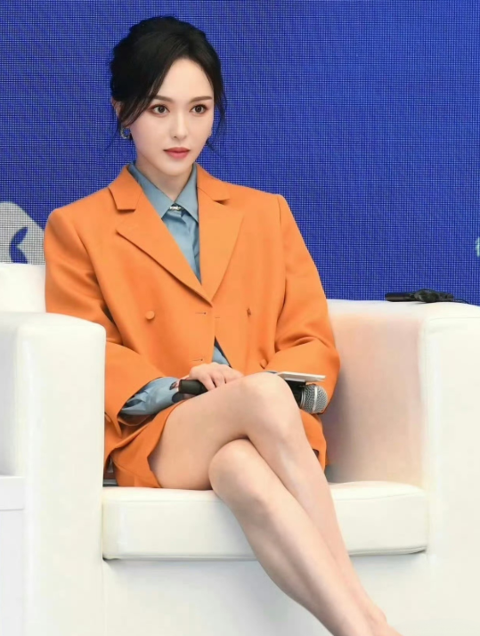 这套亮橘色西装太有挑战性了,而唐嫣却穿出了体制内女友的美感。