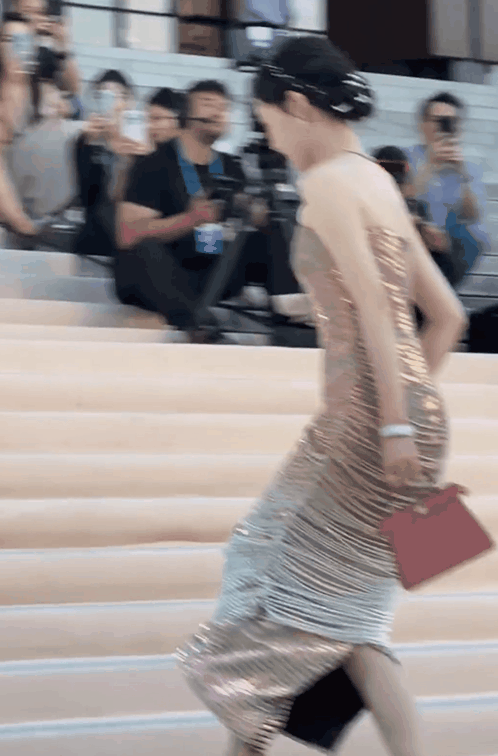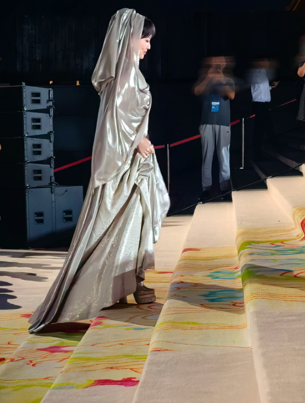 而且她的造型比其他年轻人还要大胆,身披银灰披巾+蛇皮纹亮片长裙,将异域风情拿捏了。